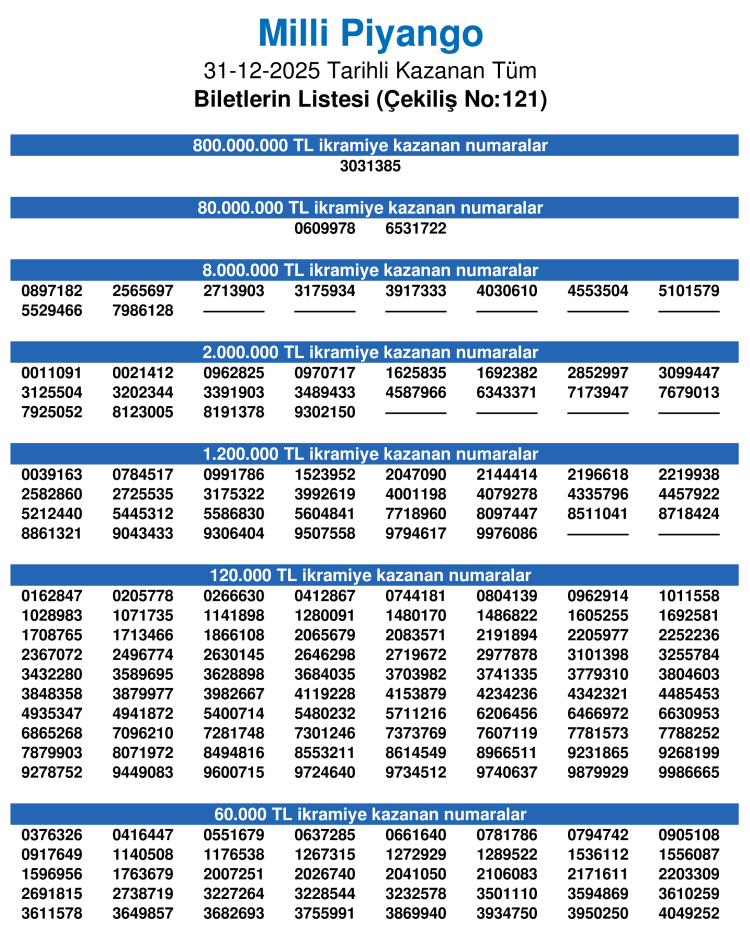 Tüm çekilişler tamamlandıktan sonra resmi sonuçlar ve bilet sorgulama için Milli Piyango’nun resmi internet sayfasını ziyaret edebilirsiniz